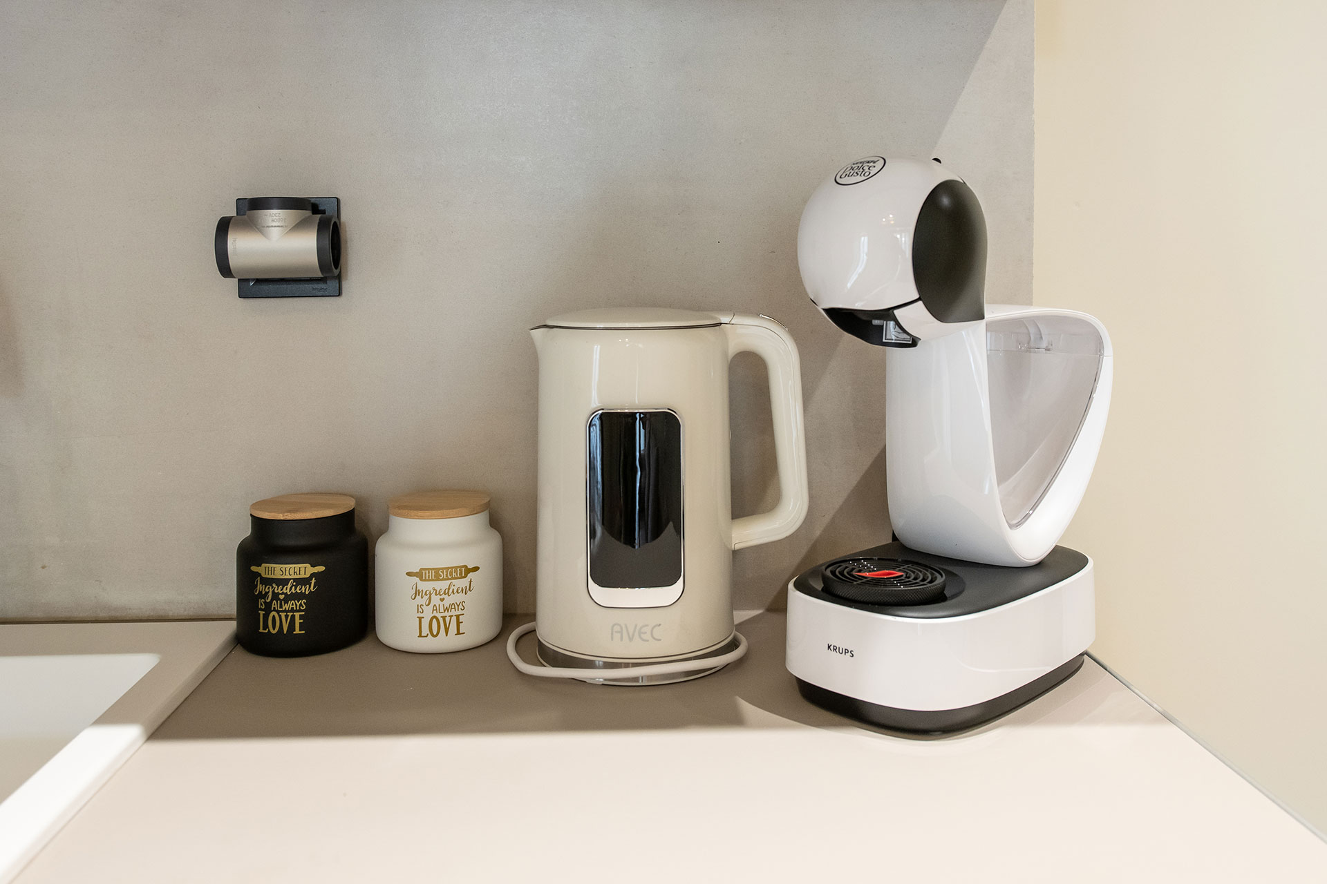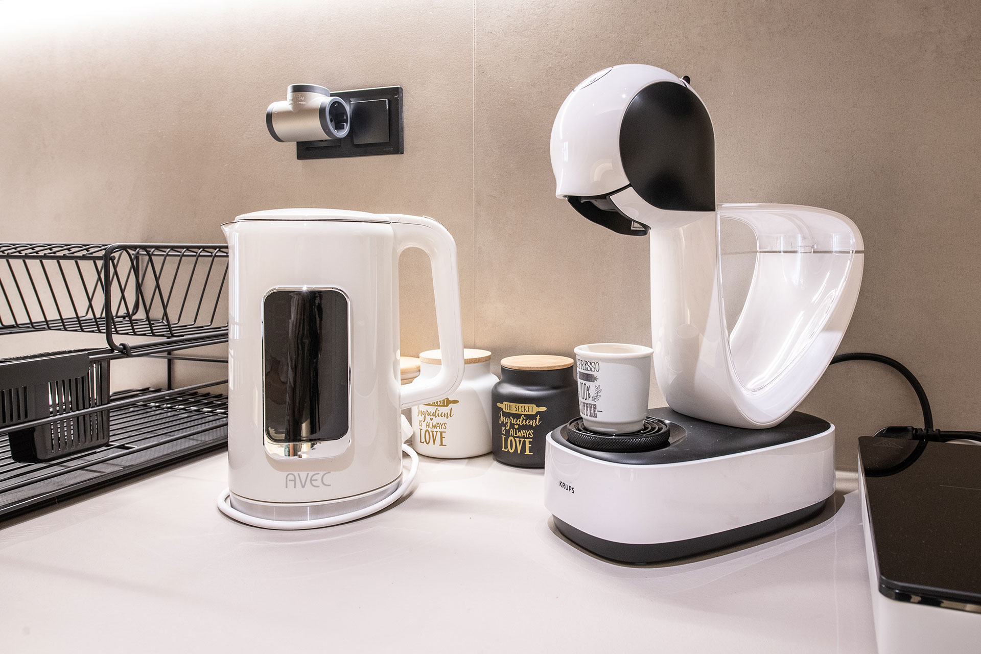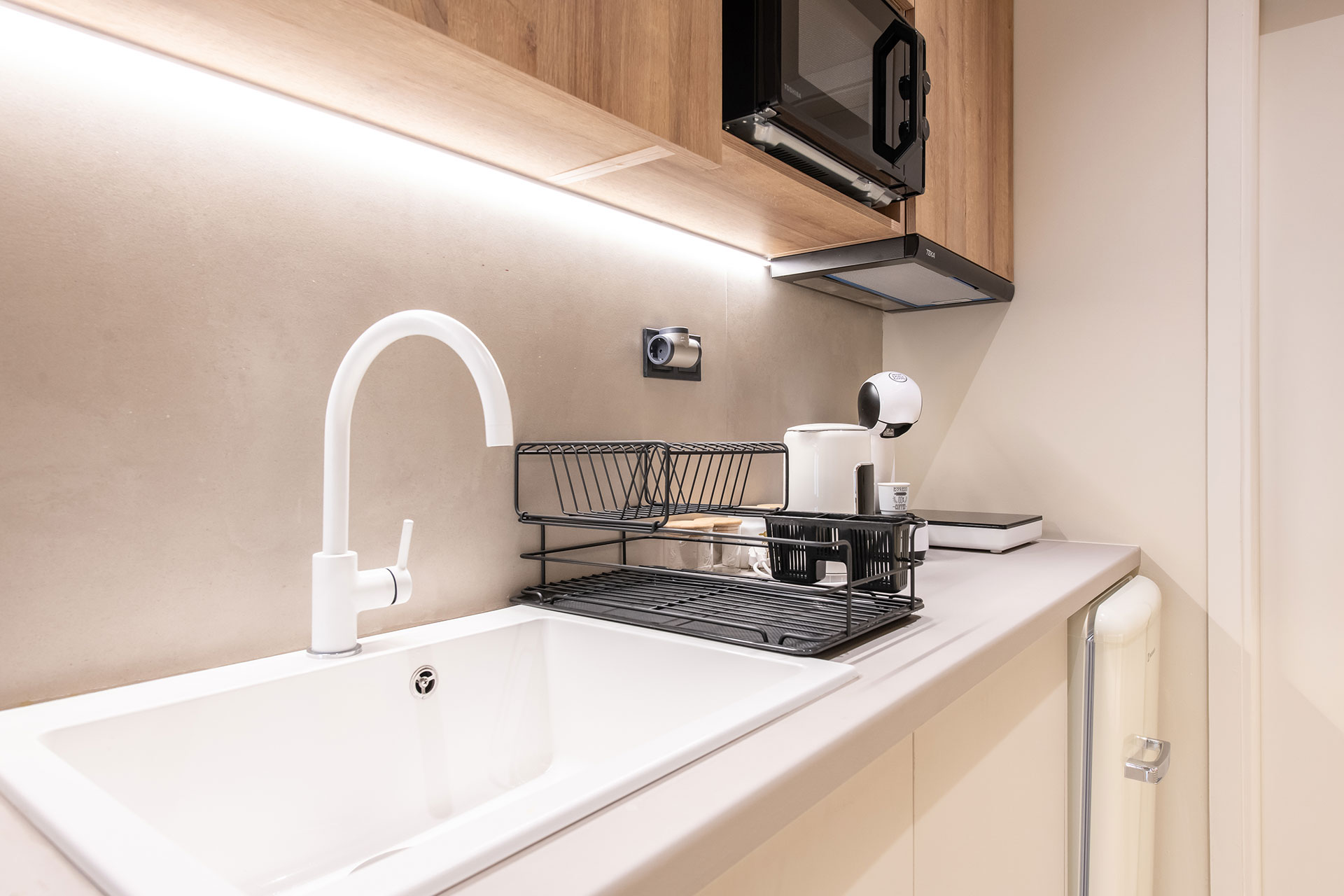 – A fully equipped kitchenette (oven, microwave, refrigerator, stovetop, coffee machine, electric kettle)