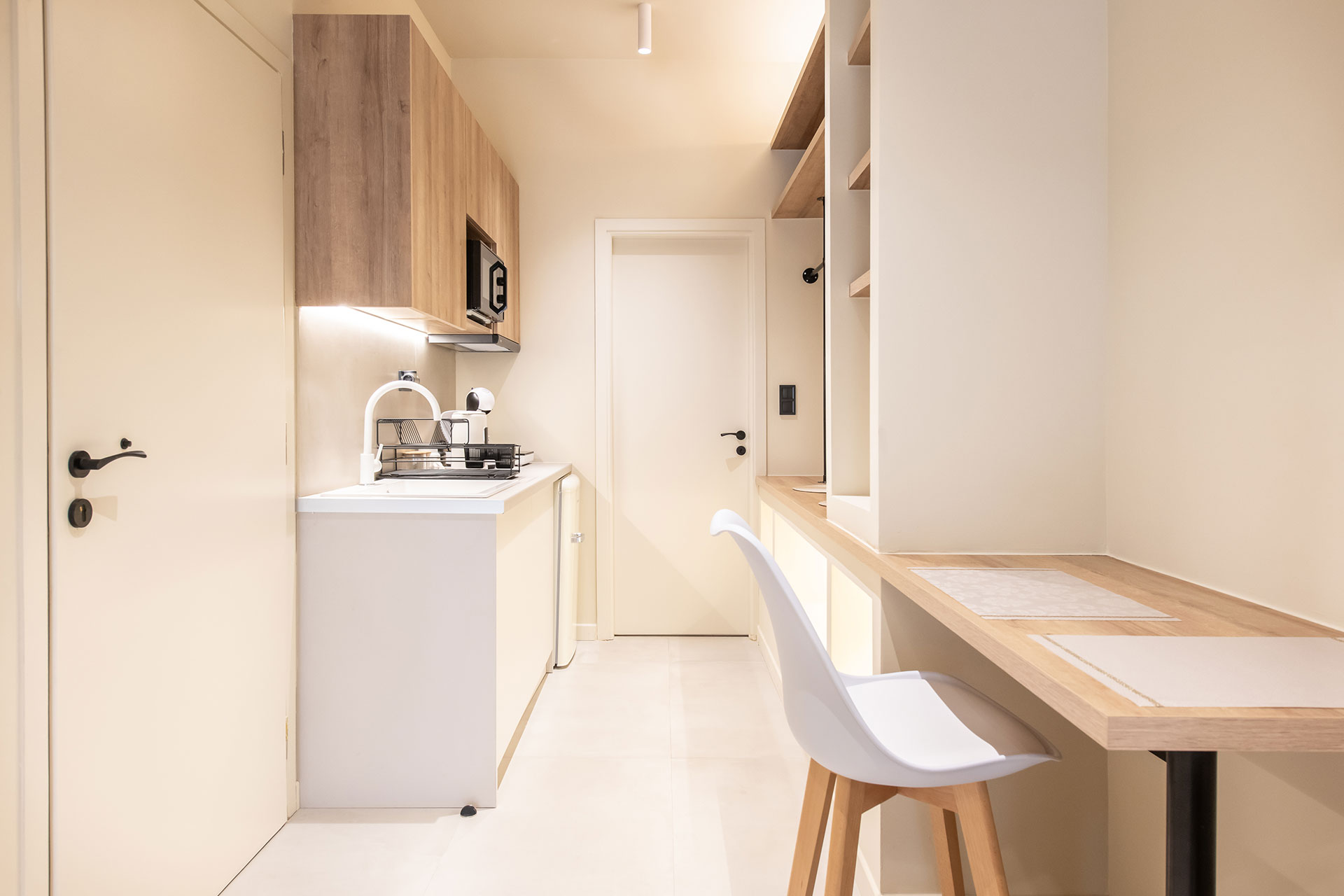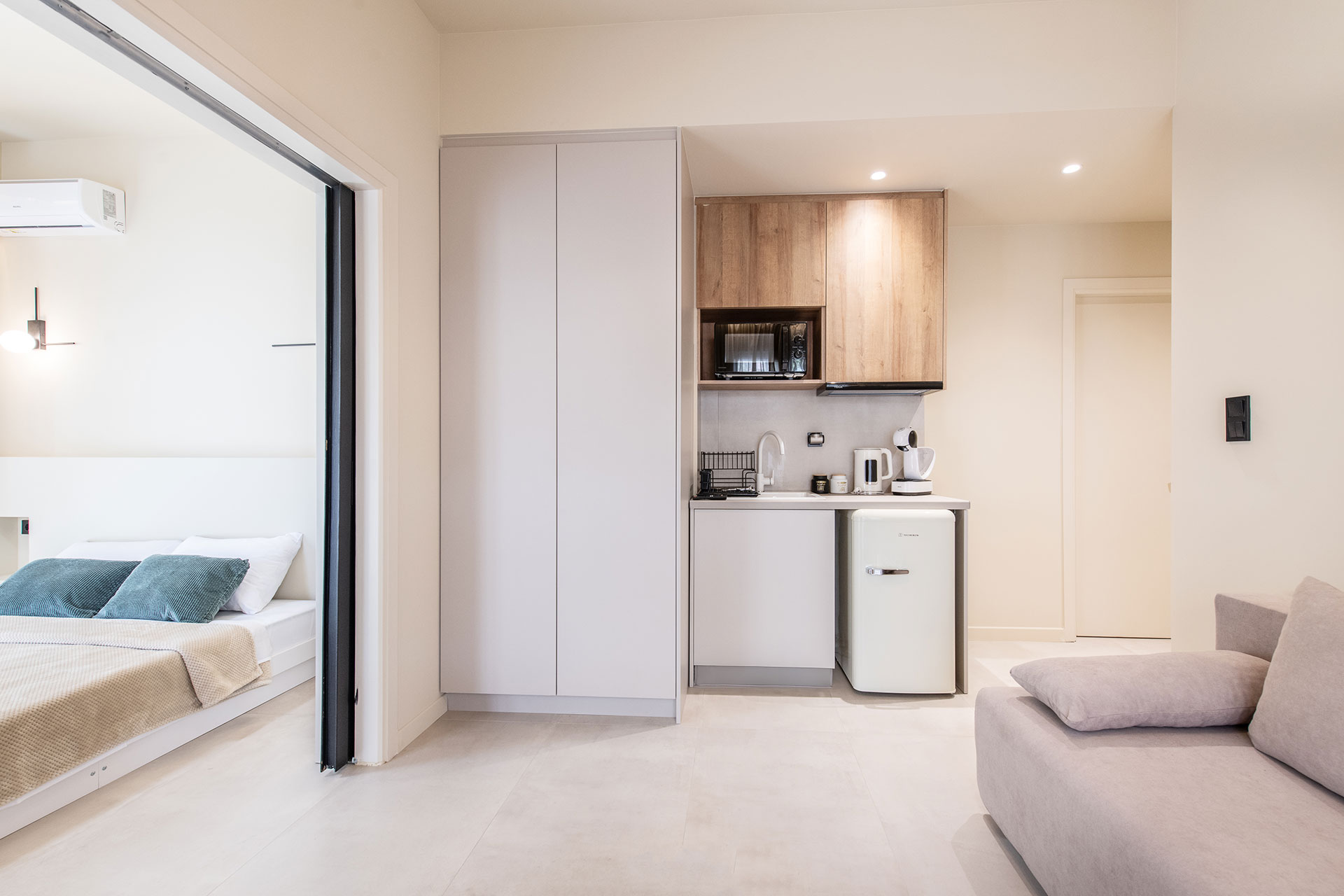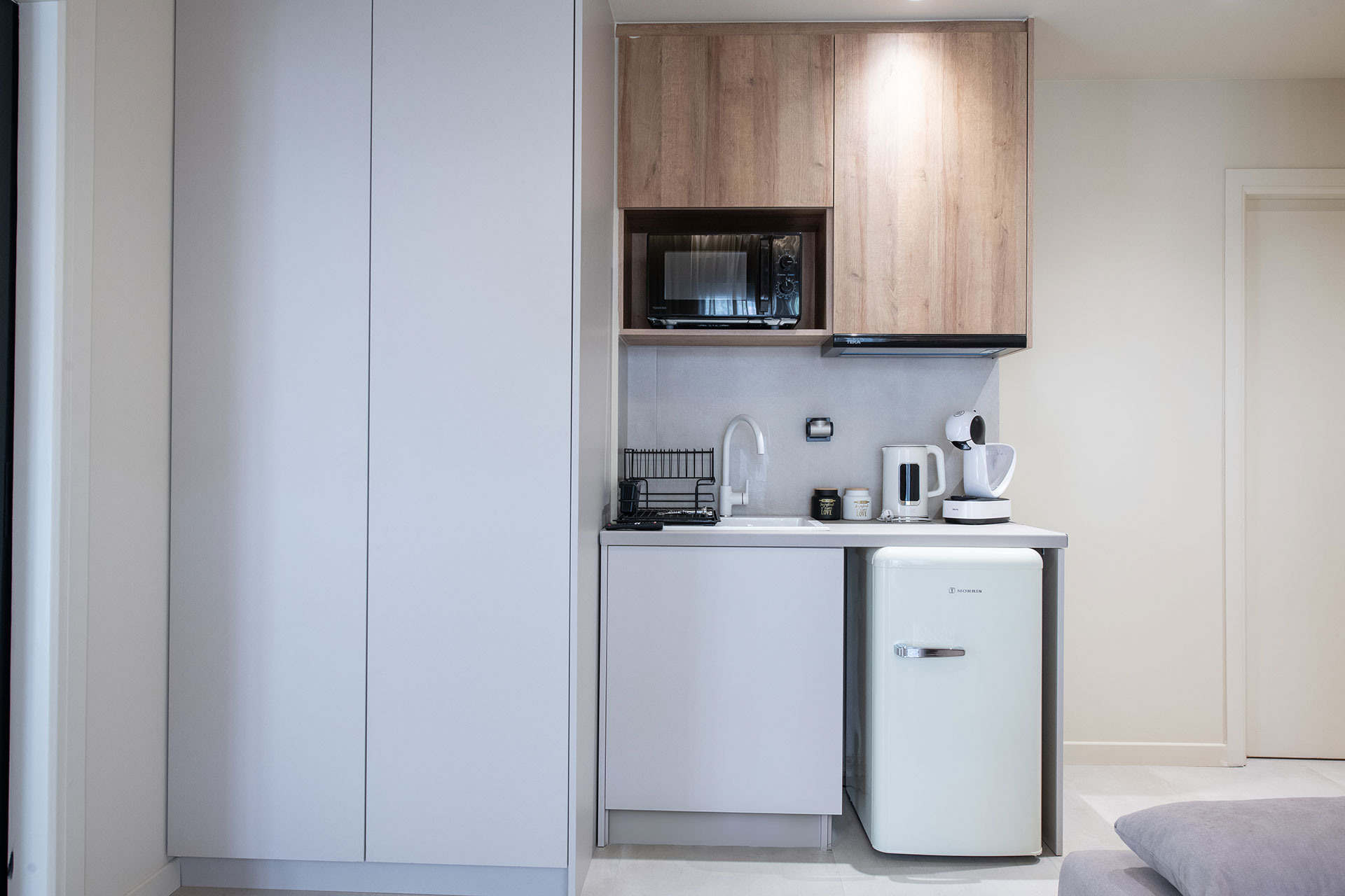 – A fully equipped kitchenette (oven, microwave, refrigerator, stovetop, coffee machine, electric kettle)
